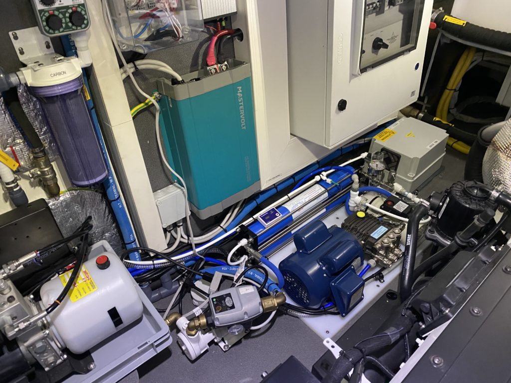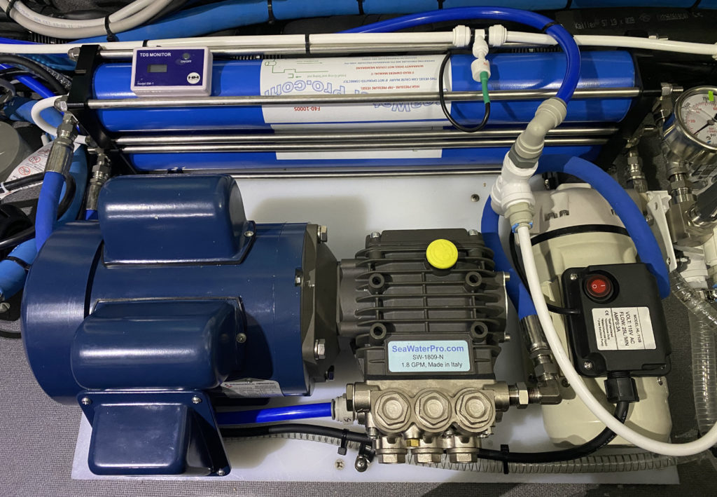 Custom fitting the watermaker system requires preparation. H20 Marine configures and runs hoses and connections prior to installation. The drive assembly/pump/membrane unit is mounted horizontally and custom fitted into bulkheads.